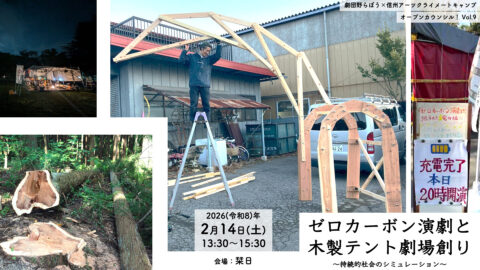2026.02.04お知らせ【2/14開催】「ゼロカーボン演劇と木製テント劇場創り〜持続的社会のシミュレーション」劇団野らぼう×信州アーツクライメートキャンプ / オープンカウンシル! Vol.9 -