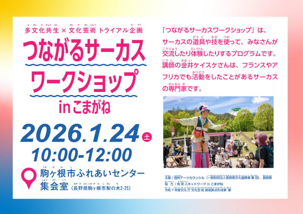 今回は、「多文化共生×文化芸術」の取組として、上伊那エリアに住む海外ルーツの方との交流に関わる活動をされている皆さんとともに、ソーシャルサーカスのワークショップを行います。